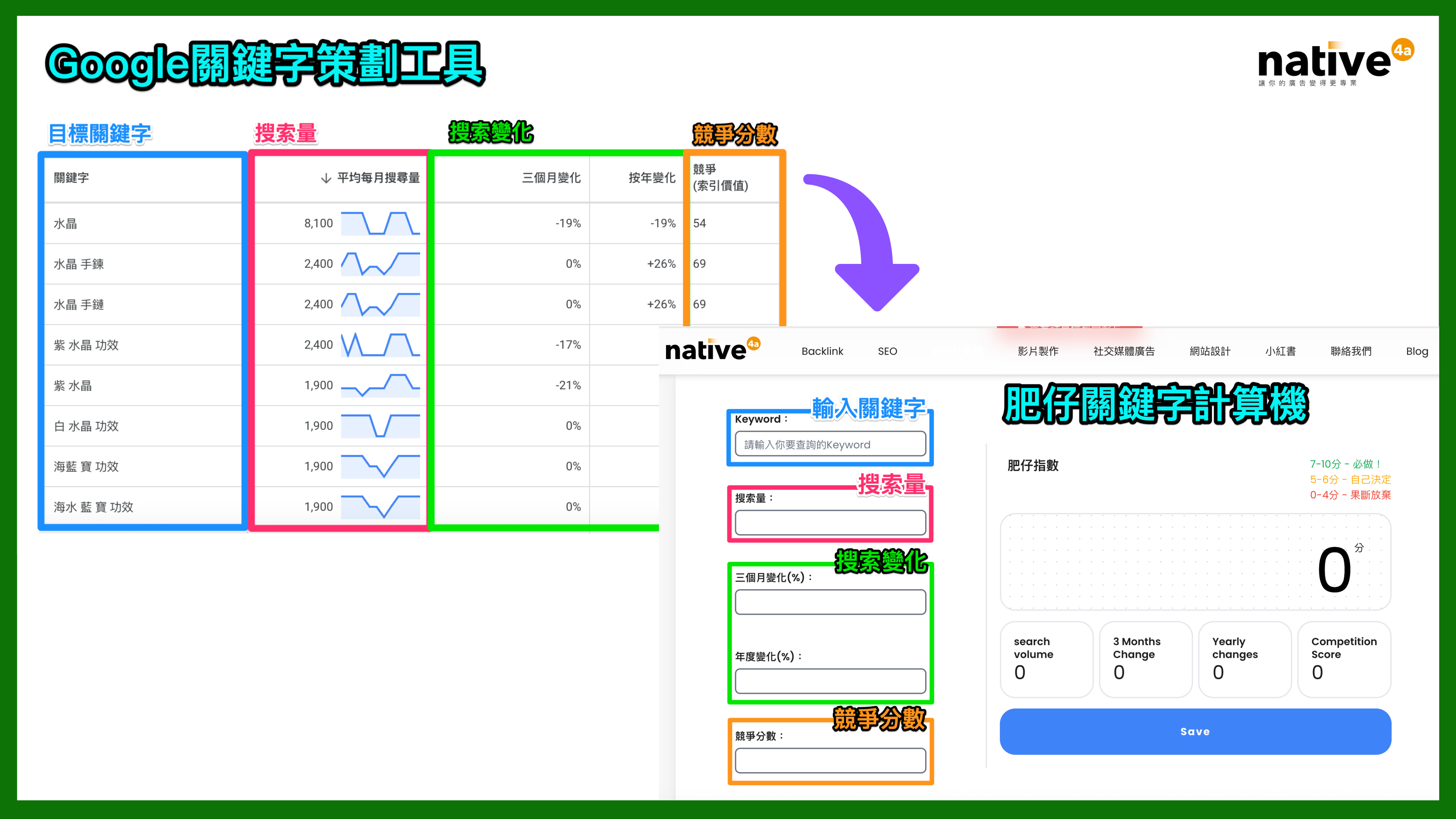 善用 Google Keyword Planner + 肥仔關鍵字計算機: 呢啲工具可以幫你搵到「搜尋量高、競爭低」嘅關鍵字,計算關鍵字嘅潛力值。