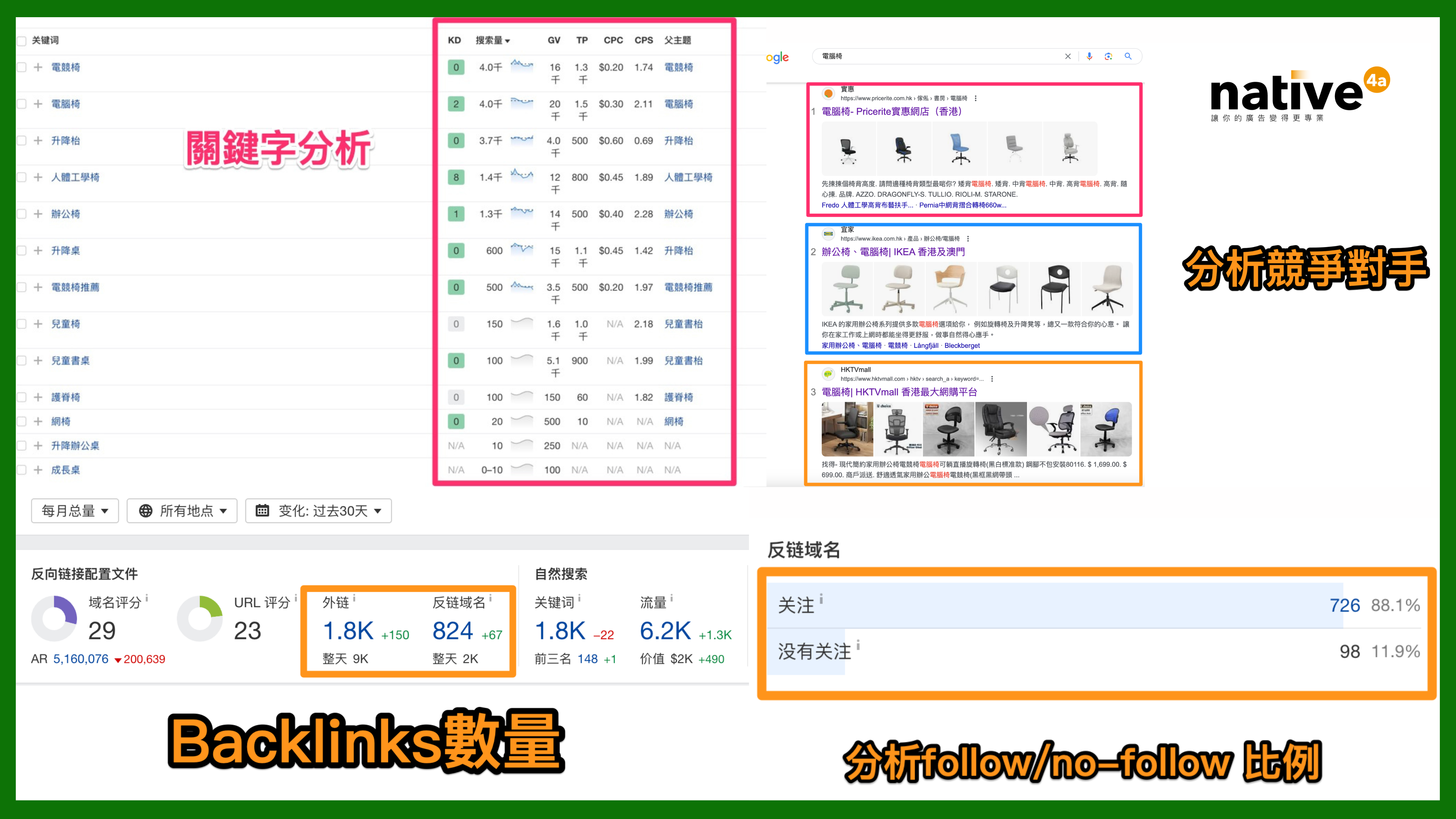 購買可靠的backlinks建立服務:選擇有經驗的SEO公司幫你建立backlinks,佢哋有大量Guest Post List + PBN(Private Backlinks Network) 呢啲資源都係日積月纍儲返嚟,而且熟悉Google演算法,以自然頻率添加backlinks,可以 有效幫你快速提升排名。例如:native SEO:立即查詢backlinks服務
